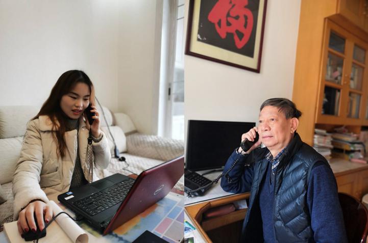 系防控工作办公室主任陈俊合(右)、辅导员夏玲玉(左)通过电话联系身在湖北的师生,了解相关工作情况