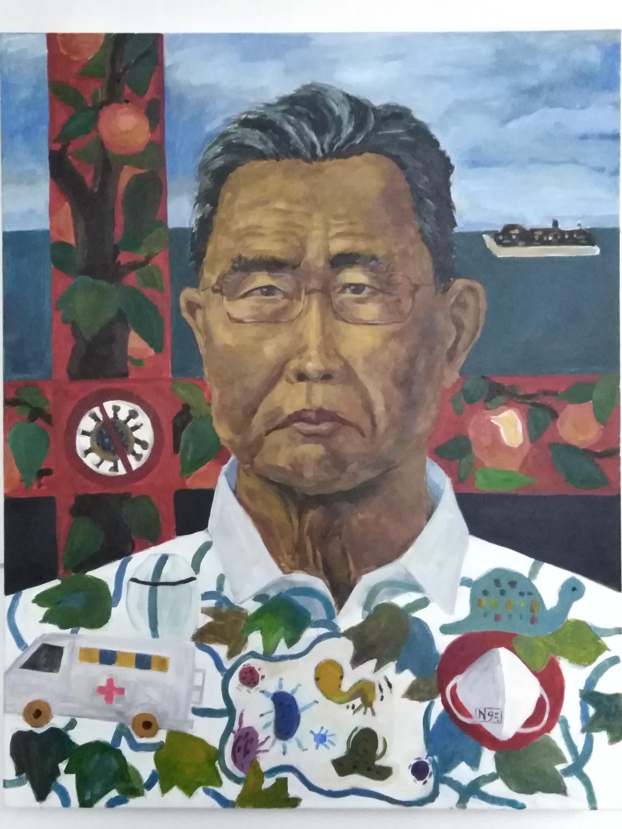 《深思》这幅作品,以钟南山院士为原形,体现抗疫过程中,中华民族的脊梁和担当。疫情暴发,他临危受命,出任国家卫健高级别组专家组组长。他每日的工作强度极高,在这幅作品中,钟南山院士正在为疫情而忧心,深切思考,体现他爱国爱人民的博大情怀。画中背景的树上禁果被偷吃,也让人类对自身的贪婪进行反省,懂得敬畏大自然,爱护大自然。