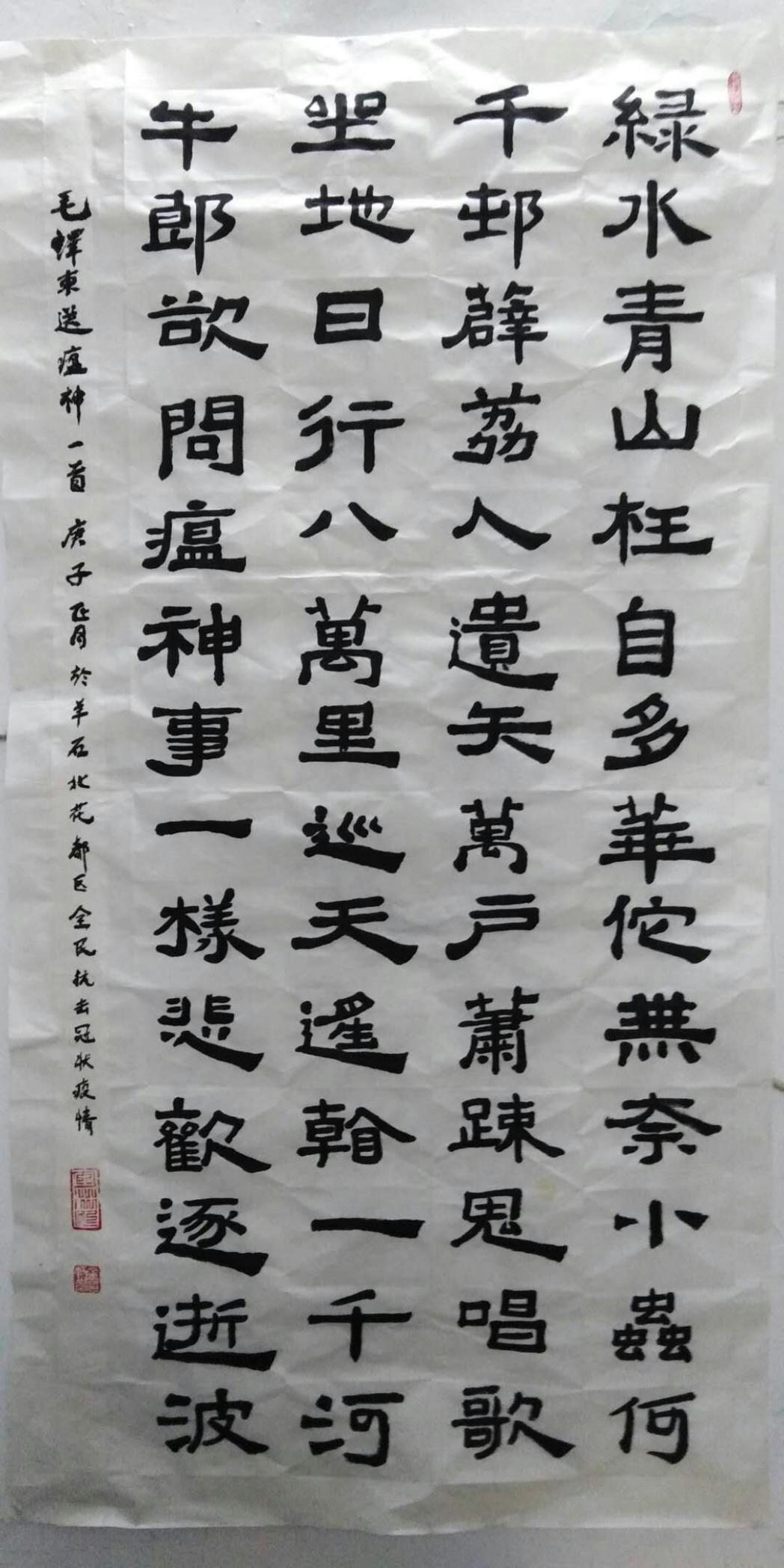 当前,疫情防控工作正处在最吃劲的关键阶段,正在展开着一场命运攸关的卓绝斗争。隶书抄写毛泽东主席的诗词《送瘟神》,期盼早日送走疫情“瘟神”。