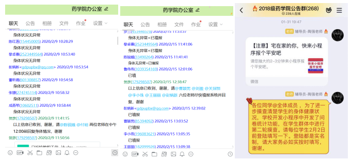 1月24日开始,学院执行疫情监控每日报告制度,实行个人、院系、学校三级联报,全体师生每日线上“报平安”,各办公室、年级、班级层次落实,实现师生信息采集100%覆盖。2月15日,学校启动教职工“天天报平安iXH”小程序打卡工作。为掌握教职工第一手身体健康信息,学院采取教职工“每日线上报平安+ iXH小程序打卡”双重模式,由学院办公室督促执行。