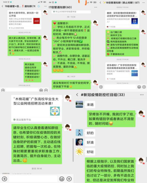 此外,为确保2020届毕业生顺利完成论文,论文指导教师在线上耐心指导学生论文的撰写。同时,鼓励毕业生在疫情防控期间积极求职,密切关注学校和就业信息网的相关信息;学院简化就业手续,建议毕业生在“广东大学生就业创业”微信公众号平台填写电子就业协议,实现无纸质、无风险的就业签约等。病毒虽阻隔了师生空间上的距离,却阻隔不了心灵上的互助共进。学院千方百计保障学生成长“不掉线”,做到战时有“力”。