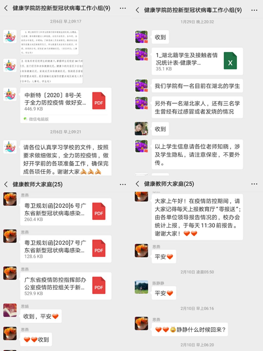 学院健康学院(下文简称“健康学院”)高度重视新冠肺炎疫情防控工作,提高政治站位,做到守土有责,守土尽责,严格贯彻落实学校疫情防控应急预案。1月28日,按照学校的统一部署,紧急制定了《健康学院防控新型冠状病毒感染的肺炎疫情工作方案》并第一时间成立“防控新冠肺炎疫情工作小组群”,统筹学院的疫情防控工作。畅通沟通渠道,及时传达上级主管部门及学校各部门关于抗“疫”的文件精神,第一时间组织摸清院内23名教工及310名学生的动向及健康情况。办公室行政教辅人员每日跟进教师、学生健康状况,整理上报师生数据,实现师生信息采集100%覆盖,确保信息报送及时准确。