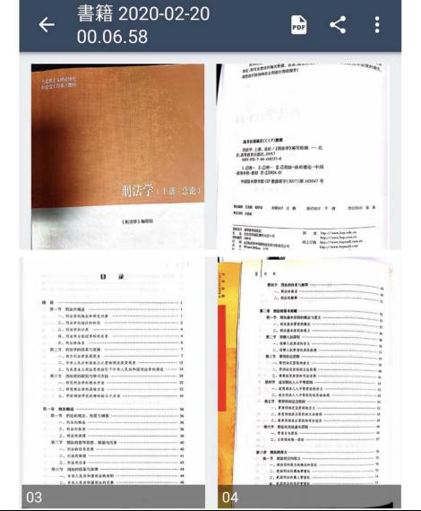 3.完善教学材料,制作电子教材。教材对于学生学习新课是十分重要的知识载体,由于“马工程”刑法学系列教材在学院乃至全国是首次使用,学生手上并无教材。因此,冯家欣老师使用手机扫描软件,将教材前六章的内容逐页扫描,整理成电子书籍,上传至学习通平台供学生在家期间学习使用。