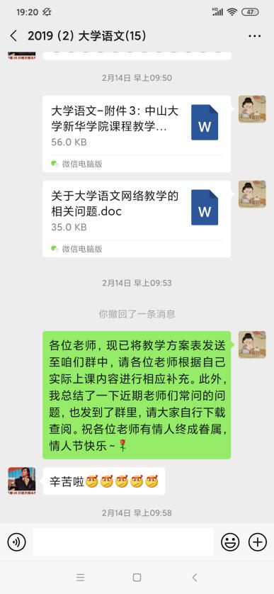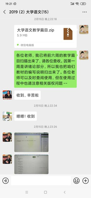 首先,我建立了“2019(2)大学语文”微信群,召集老师们线上集体备课,向本学期教授大学语文课程的老师推广“激越四段式教学法”,并确定2020年春季“开学不返校,教师不停教,学生不停学,管理求实效”期间的授课章节。