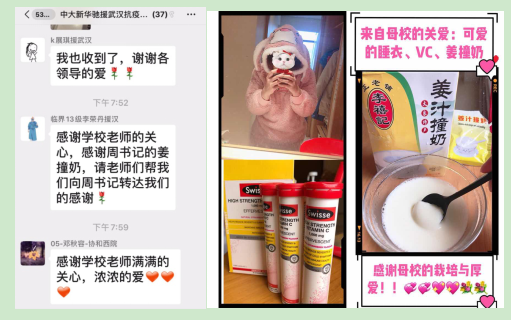 “热气腾腾的姜汁红糖在手,即使天寒地冻心里也暖洋洋。”一线校友们用各种方式积极回应母校的爱护与温情,透露出抑制不住的幸福与感动。