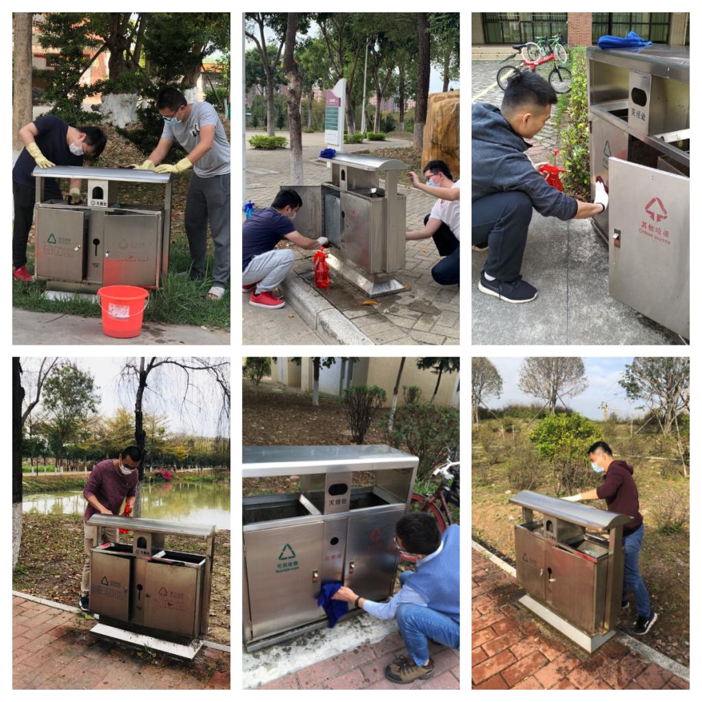 正值疫情防控的特殊时期,支部党员同志们戴上口罩,走上校道,对校区内所有不锈钢垃圾桶进行清洗及擦拭消毒,彻底消杀各类病毒、细菌滋生的温床。