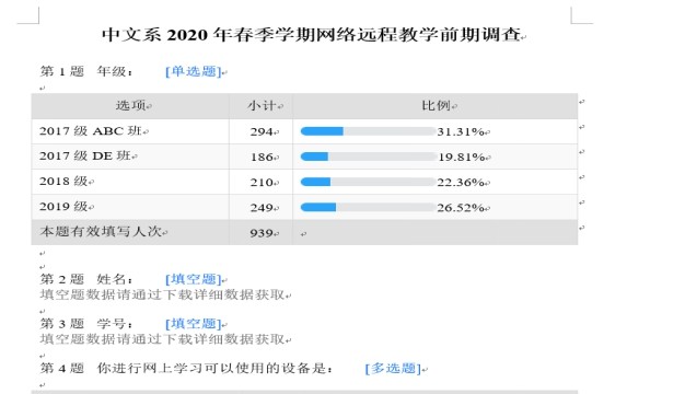三是心系学生,密切关注学生学习状态。为了密切关注、全面了解学生对于线上教学的态度、意见,在学校线上教学授课情况调查问卷的基础上,林玮老师与中文系李想等老师一同探讨,专门设计了全系学生对网络教学满意度调查问卷,并由各班班主任组织开展调查。问卷主要涵盖“学生如何看待网课” “学生如何看待任课教师的线上课堂表现”“学生如何看待自己的线上课堂表现”等问题。通过具体实在的调查数据,全面了解各年级学生对线上教学的期待、要求与评价……有助于更有针对性地组织、推进全系的教学工作。