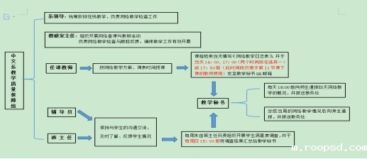 制订教学方案之后,根据学校要求,林玮老师提议组织成立了包括系领导、任课教师、班主任、辅导员及教务秘书等在内的中文系网络教学质量保障工作组,并组建了专门的微信工作群,组织制订了《中文系2020年春季学期开学不返校期间教学质量保障举措》。为了让工作组各位成员简单清楚地了解各自工作,保证各项教学工作运行顺畅,林玮老师还专门绘制了《中文系教学质量保障组工作流程图》,更好地协调了工作组各成员之间的合作,提高了工作效率。