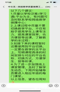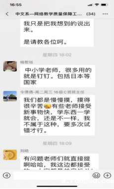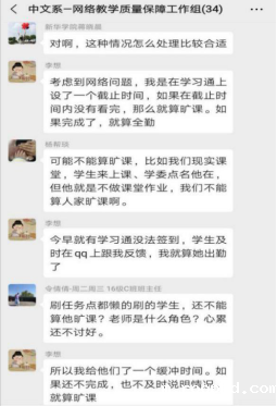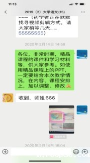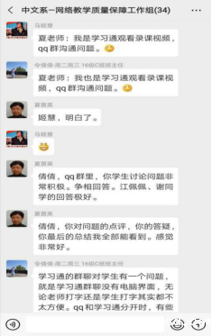 一是打造温馨和谐、更具实际效果的交流平台。为了缓解部分老师在教学过程中的疑虑、不安等情绪,经请示宋俊华主任和夏茵英书记,林玮老师以“中文系网络教学质量保障工作组”微信群为阵地,组织全系教师进行线上集体备课与教研活动,实时在线讨论教学过程中遇到的新问题、分享新办法。例如对学习平台的使用建议,对各种学习平台性能的探讨,学习通签到、讨论等功能的使用技巧分享,甚至教学使用麦克风品牌的推荐介绍等等。
