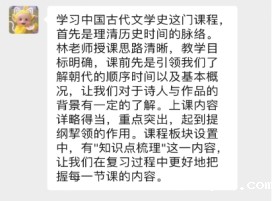 学习《中国古代文学史》这门课程,首先是理清历史时间的脉络。林老师授课思路清晰,教学目标明确,课前引领我们了解朝代的顺序时间以及基本概况,让我们对于诗人与作品的背景有一定的了解。上课内容详略得当,重点突出,起到提纲挈领的作用。课程板块设置中,有“知识点梳理”这一内容,让我们在复习过程中更好地把握每一节课的内容。