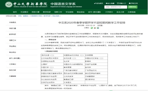 在充分了解学生网络使用情况后,2月19日前,经中文系党政领导班子商定,由林玮老师组织制订了《中文系2020年春季学期开学不返校期间教学方案》,确定了本学期实际开设的线上课程及相关教学方案,明确了各门线上课程的学习要求、评价方式、注意事项等,明确了个别无法实施线上教学课程的补课安排。