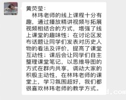 本学期的线上教学,中文系邵言言老师与林玮老师一同负责《中国古代文学史》课程,她讲到:“林老师是我上《中国古代文学史》的领路人,一起合作教授2018级汉语言文学专业,她对我的帮助和影响很大。首先是她端庄、文雅、稳重的台风。急性子的我,总是被她的教学风格感染,然后学会放慢自己的授课步伐,调整自己的授课内容,耐心跟学生交流。其次是她做事的认真、细致和高效。她总是能及时提醒我课件、试卷等的细节疏漏。最后是她乐于助人,乐于分享,她会在线上教学过程中,跟我分享相关教学资料,引导我做好科学合理的线上教学规划,在这次线上教学过程中,她真的帮助我成长了很多。”