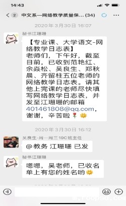 线上教学对中文系师生而言,是一个全新的尝试,在前几周的教学过程中,需要不断调整和磨合。林玮老师主动思考、心系师生,充分发挥了其敏锐、细心、严谨的性格特点,使中文系网络教学工作稳步推进,顺利运行。具体体现在以下几点: