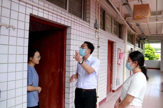 谭杰文副主任(中)、刘静丽副书记(右)在宿舍了解同学们返校情况