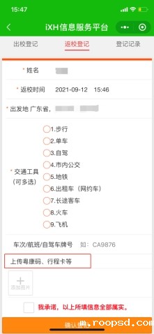 新生来校报到前,须在iXH小程序“返校登记”功能中进行报到申请,按照实际情况如实填报来校报到信息,上传“粤康码”和“行程卡”截图,填写完成后提交给院系辅导员审核,院系审批通过后,学生方可来校报到。节省了到校后的审批流程,提高了报到效率。报到当日,学生只需要在校门口完成体温检测后,即可凭借iXH健康码绿码轻松“扫码入校”,跟随志愿者实现专业报到点和宿舍楼“两点一线”。