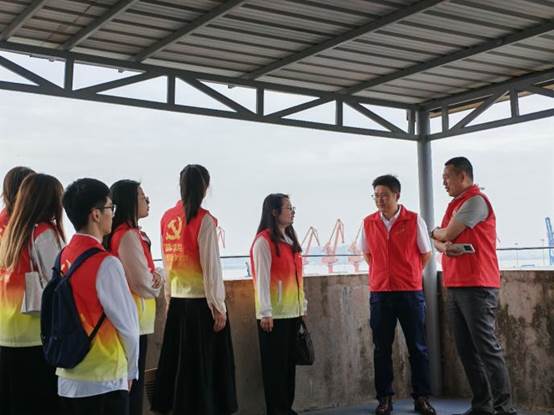 两支部同志们一起登上散杂货营运中心顶台俯瞰整个港区全貌与作业实况,公司领导详细现场介绍了公司的港口布局及目前的运营情况。