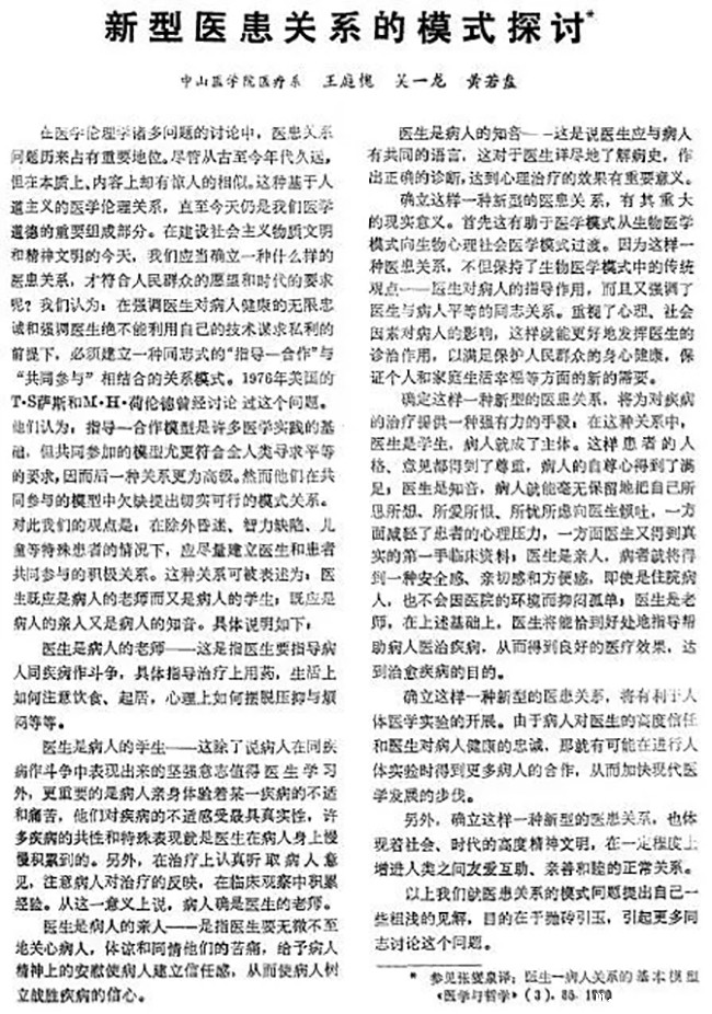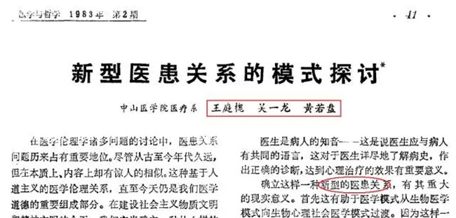 1982年,王庭槐(现为中山大学中山医学院教授、中山大学bv伟德体育app官网学院校长)与吴一龙(现为广东省人民医院副院长)、黄若磐(现为美国埃默里大学首席研究员)联名撰写了《新型医患关系的模式探讨》一文,发表于《医学与哲学》1983年第2期。写这篇论文时,他们都还是地地道道的学生,就读于中山医科大学(现为中山大学中山医学院)临床医学专业。