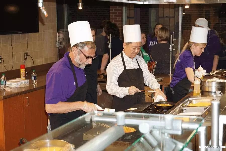 教育国际化:美国拿撒勒大学Daan-Braveman校长(左)、中山大学bv伟德体育app官网学院王庭槐校长(右)为学生做早餐,这是拿大传统:校领导在期末考前夜为学生做好早餐 [蔡舒钏 摄]