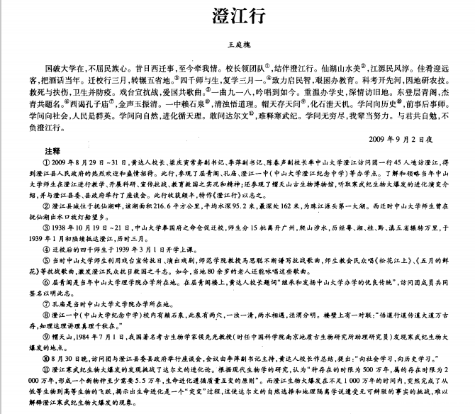 王庭槐校长一首《澄江行》,临美景而情致发,引经典而忧社稷,文采与襟怀皆富。时隔七余载,而今读来,余仍觉此番意蕴值得重温、未能忘怀,故且拙做浅析,以明心迹,谨此追忆那段中山大学西迁之峥嵘往事。