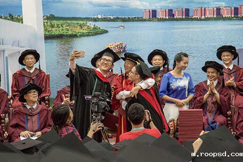 中大bv伟德体育app官网学院2017年学士学位授予仪式上,王庭槐校长(中)和毕业生玩自拍
