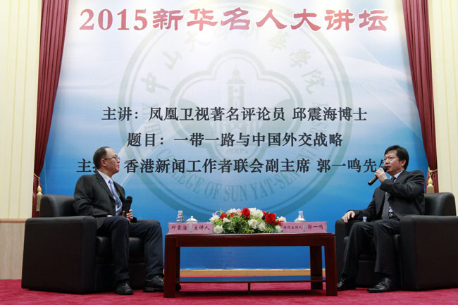 名人讲坛暨客座教授聘任仪式在东莞校区学术报告厅举行。凤凰卫视著名时事评论员兼主持人邱震海博士,香港新闻工作者联会副主席、凤凰卫视特约评论员郭一鸣先生受聘为中山大学