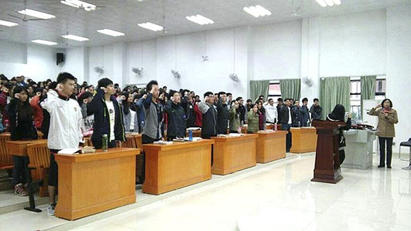 李岚教授(右)带领法律学系学生向宪法宣誓