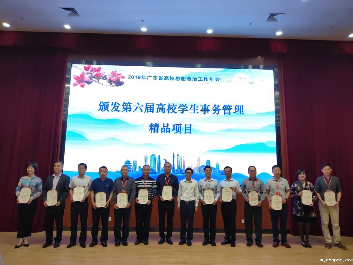 会议举行广东省网络思想政治工作中心揭牌仪式和广东高校思想政治工作网络平台发布仪式,并对2018年“新时代新作为——立志·修身·博学·报国”主题教育活动获奖项目、第六届高校学生事务管理精品项目等获奖奖项进行了表彰。我校贯彻“三全育人”理念推行的“全方位育人”项目——《“勿忘初心·青春随行”新生入学主题系列教育活动》获第六届高校学生事务管理精品项目,学生处徐仲亨副处长代表学校领奖,中山大学党委学生工作部钟一彪部长为获奖项目进行了颁奖。