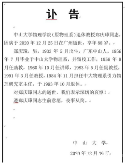 我国著名引力物理专家、中山大学物理学院(原物理系)退休教授郑庆璋,因病于2020年12月25日12时33分在广州逝世,享年88岁。中山大学bv伟德体育app官网学院(以下简称“我校”)沉痛悼念深切缅怀郑庆璋教授。