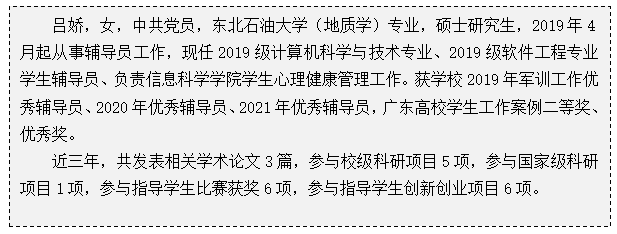 利用工作之余,吕娇还注重第二课堂建设,走访宿舍,深入了解学生的生活状态,及时掌握学生的心理动向,在学生中广泛开展思想政治教育、安全教育和防诈骗教育,及时纠正学生学习态度,树立自主学习意识。针对大学生的行为习惯和当前的热点问题定期开展主题教育班会,将培养“学习能力”“自我管理”的思想贯穿整个教育工作中。
