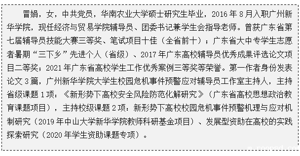 古人云:“工欲善其事,必先利其器”,自入职以来,冒娟一直坚信要出色地完成工作,务必提升自我的理论水平和业务知识水平,作为一名一线辅导员兼团委书记,工作职责首要是做好对学生的思想理论教育和价值引领。因此,在日常工作中,冒娟一直努力学习信息化知识和各项政策,不断提高自身素质和工作本领,并将理论知识整理成文章并发表学术文章。在此方面,她主持伟德app入口大学生校园危机事件预警应对辅导员工作室1项,主持省级课题1项,校级科研课题2项。其中发表的论文《关于独立学院精准扶贫和创新资助育人方式的探索研究》获评2019年全国民办高校学生工作创新成果三等奖;《民办高校辅导员和本科生导师工作配合问题研究--基于博弈论视角》获2017年广东高校辅导员优秀成果评选论文项目二等奖,《一例由宿舍矛盾引发的校园危机案例分析》获2021年广东高校学生工作优秀案例三等奖。