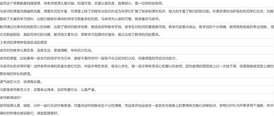 “老师讲课认真投入,善于举例,让学生联系实际,深入理解课程内容。”“马老师的课堂风格幽默风趣,课堂形式较丰富,在课堂上除了讲授专业知识外还为同学们扩展了很多的课外知识,极大地丰富了我们的知识面。在课余课后也积极地和同学们交流,为我们提供了大量的学习资料,让我们能够在课余时间学习到更多的东西。”学生们这些温暖的话语对马姬慧而言,是肯定,更是未来教学的动力。