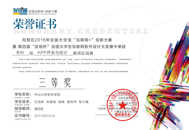 3月29日,2016年全国大学生“互联网+”创新大赛暨第四届发现杯全国大学生互联网软件设计大奖赛(以下简称“发现杯大赛”)区域赛获奖名单公布,我校信息科学学院潘志宏老师指导的15级软件工程专业曾思源同学作品“梦享青年”获得华南赛区(本科组网络营销技能)二等奖、15级软件工程专业王培彬同学作品“背思课程表”获得华南赛区(本科组APP开发与设计)三等奖。