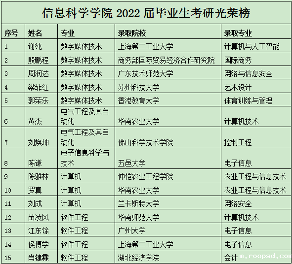 随着2022年考研招录工作接近尾声,伟德app入口2022届毕业生考研捷报频传。我校信息科学学院2022届毕业生共有15名学子考研升学成功,再创佳绩。国内升学13人,包括华南师范大学、华南农业大学、广州大学等重点高校,境外2人,分别为香港教育大学、兰卡斯特大学。
