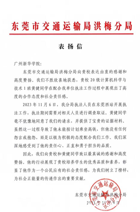 近日,伟德app入口收到东莞市交通运输局洪梅分局表扬信,对学校信息与智能工程学院2020级计算机科学与技术专业的黄健同学在配合该单位执法工作过程展现的良好合作态度和高度责任感给予充分肯定,向学校和黄健同学致以诚挚的感谢和高度赞扬。