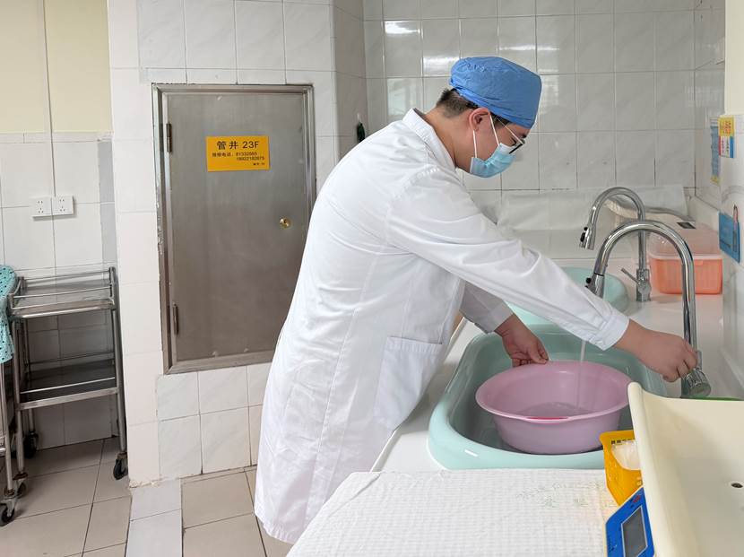 2月12日,正值春节前夕,张女士在儿子陪同下入院治疗。黄嘉莉第一时间主动上前搀扶,一边轻声安抚患者紧张情绪,一边细致询问既往病史、用药情况,规范为患者测量体温、血压、心率等生命体征,做好详细记录。随后,在带教老师指导下,她与郑贺岩默契配合,逐项核对患者信息、完善入院资料,细致做好术前皮肤准备、药物过敏试验等各项工作,全程动作规范、态度谦和,以其扎实的专业能力和贴心服务,赢得了张女士及家属的连连称赞。