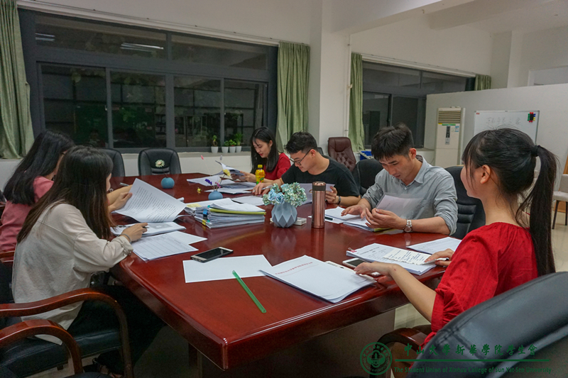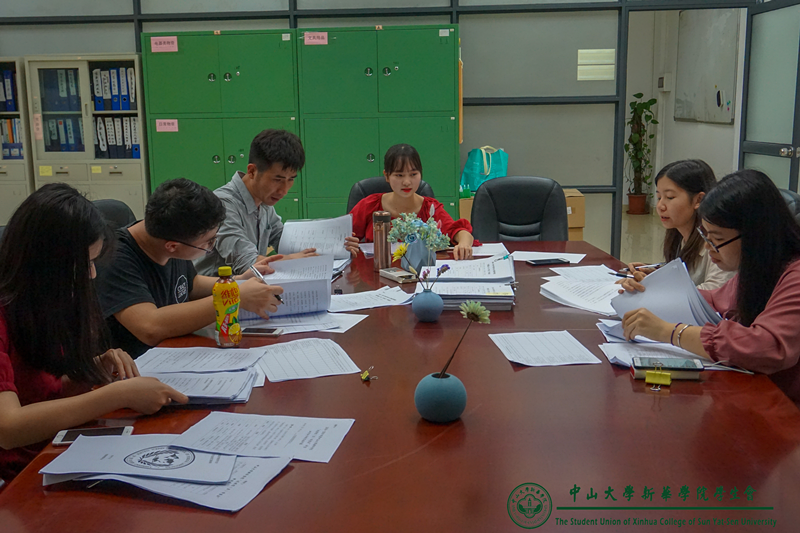 此次“优秀院系学生会评比大会”的校学生会评审小组由校学生会指导老师史可可、第十届第二任校学生会主席周伟迪同学、第十届第二任校学生会副主席兼广州校区执行主席陈泰谊同学等共计9名成员组成。此次评比大会分别在校学生会办公室(两校区)对各院系学生会提交的材料进行第一轮评审。