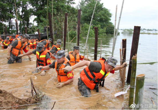 汛情就是命令,防汛就是责任。哪里有危险,哪里就有人民子弟兵的身影。在炙热的太阳底下,在凶猛的洪水面前,无数人民子弟兵再一次成为了人民的“保护神”。他们奔赴在抗洪抢险的第一线,冲在人民的最前面,日夜奋战,固堤筑坝,转移受灾群众。7月12日,江家岭村段的水位突破1988年极值的饶水河水位仍然持续上涨,连续作战十多个小时的指挥员战士们连夜加固堤坝。他们在泥水里的一双双泡发的手,一张张被太阳晒伤的脸庞,都是他们守护人民的印记。在抗洪救灾面前,他们用自己的身躯守护着这片土地,承担起保护人民,保卫祖国的责任。