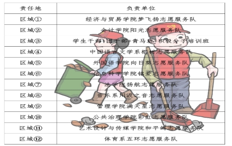 青年志愿者行动指导中心(以下简称“校青指”)联合各志愿单位通过“分片包干”形式,各自负责一个区域,开展美化校园志愿服务活动。