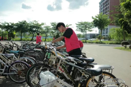 志愿者对校园内自行车进行排列摆放
