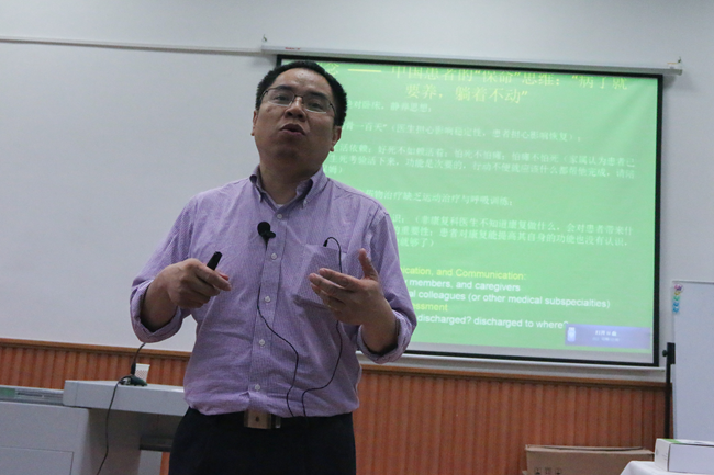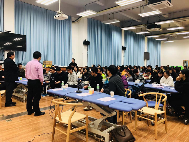刘浩教授作题为“中美康复教育的异同”的专题讲座。刘教授主要从观念、标准、形式、诊疗、体系和价值等六个方面对中美康复教育进行差异比较,还从学科认证,授课内容标准与教材,课程设置,学习内容深度、广度、新度,及师资数量和质量五大方面分类阐述康复治疗教育特色。刘浩教授说:“对患者的治疗就像教孩子走路一样”,这简单明了的一句话道明了康复医学生应如何对待和治疗患者。刘浩教授也引导同学们了解康复医师与康复治疗师之间的不同,但共同目标是提高患者的生活质量。