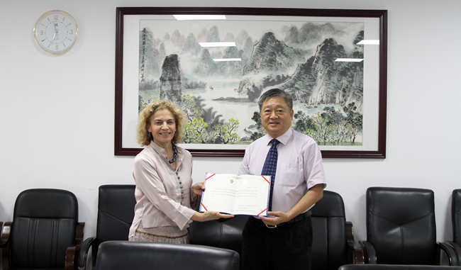 王庭槐校长(右)为Edda Silvestri院长(左)颁发聘书