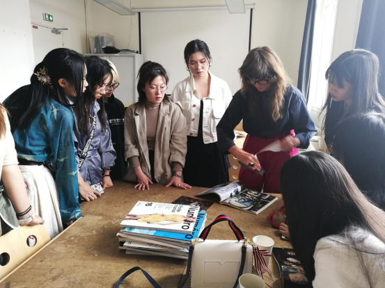 随后,同学们在老师的指导下分组完成了各自的主题灵感版设计,并相互分享设计心得。ESMOD服装设计学院的老师夸奖同学们的想法十分有个性,并表示期待大家未来能够在服装行业取得成就。