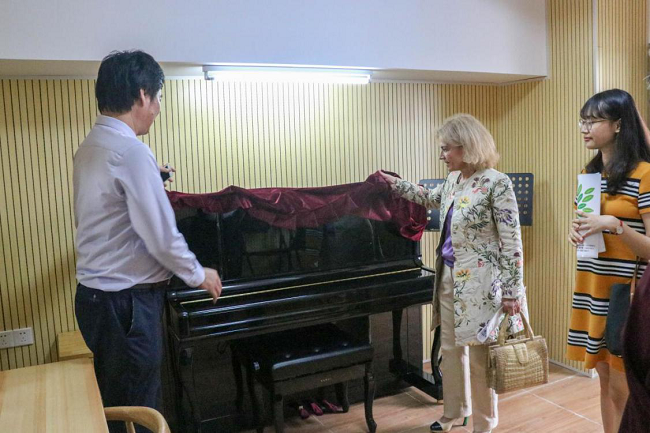 Edda教授在王庭槐校长的陪同下,还参观了音乐系的琴房等教学设施及环境。Edda教授对学校的音乐教学设施建设给予肯定,认为学校为在校的艺术生提供了良好的平台和机会,全校学生也将在浓郁的艺术教育氛围中熏陶成长。