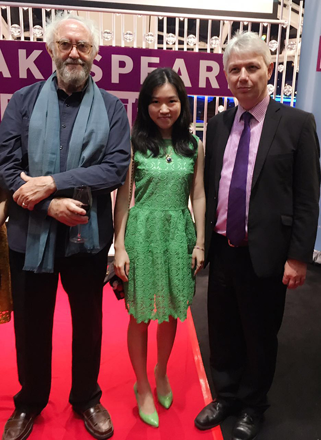 刘婉莉院长助理(中)与英国驻广州总领事卢墨雪(右)、主演乔纳森•普雷西(左)合影留念
