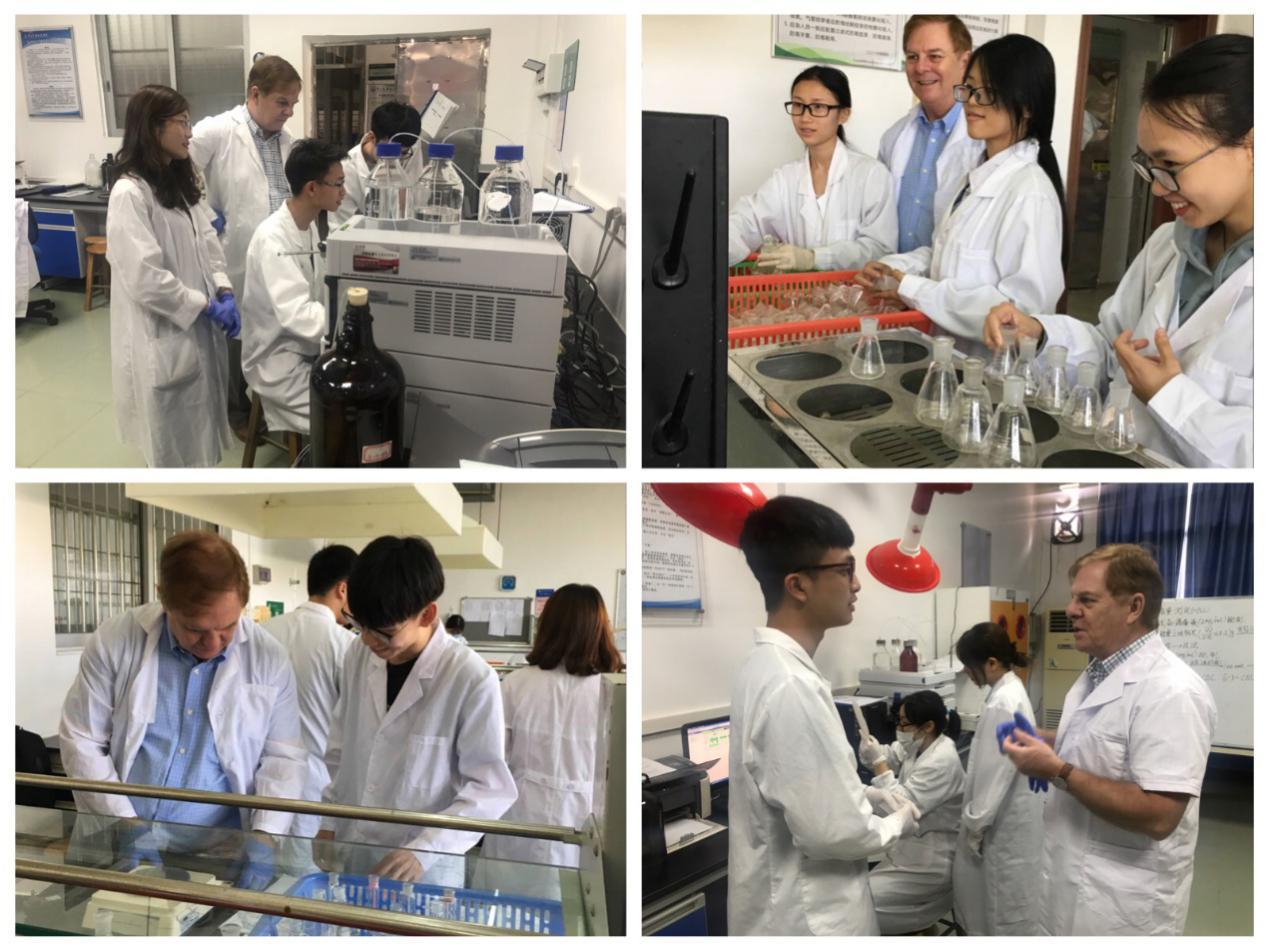 Peter J.Little教授在药学院实验室与张素中副院长、陈锐娥老师、曹颖男老师及刘盈老师为15级药学院学生同堂讲授《药物分析》实验课共计9节;Danielle Kamato博士与曹颖男老师、唐旗羚老师、刘盈老师、周满如老师为15级和16级药学院学生同堂讲授《药物化学》和《临床药理学》理论课,共计12节。