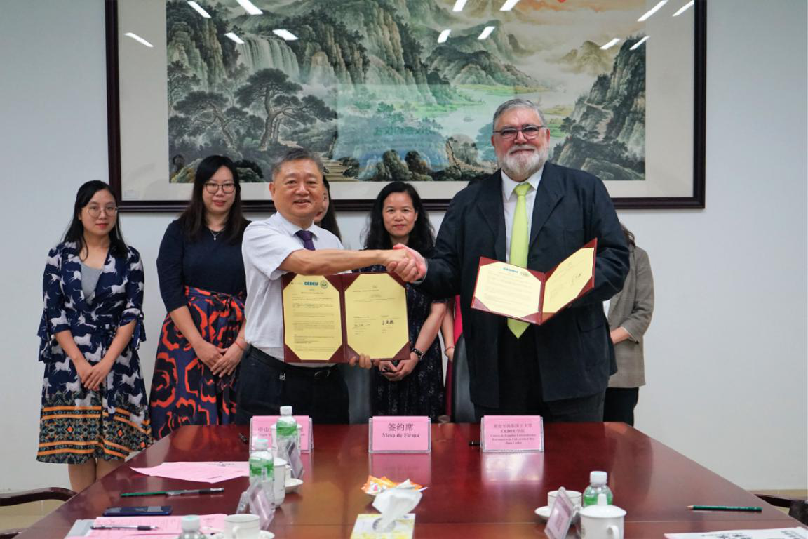 学院与西班牙胡安卡洛斯国王大学CEDEU学院签署合作协议仪式在东莞校区格物楼举行。西班牙胡安卡洛斯国王大学CEDEU学院校长Juan Alfonso Cebrián Diaz(以下简称“Alfonso Cebrián校长”)一行2人,我校校长王庭槐,外事处、外国语学院代表出席签约仪式。本次签约会议由我校外国语学院执行院长廖益清主持。