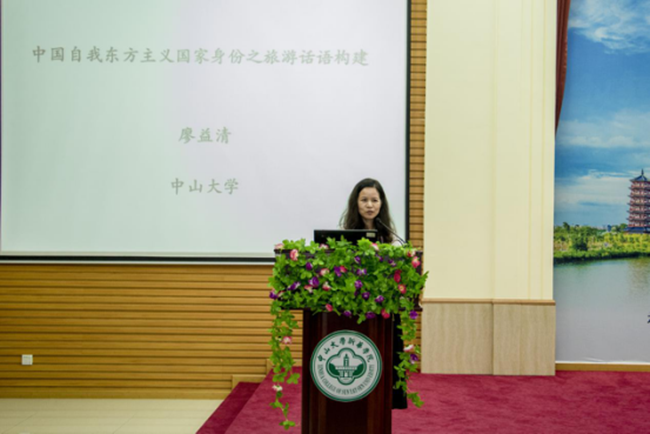 廖益清在本次报告中提出了新的思路:将国家身份与旅游话语二者相结合。她从研究背景展开分析,讲述了在全球化的语境下,旅游业被视为国家身份的镜子和构建者,然而东方旅游形象主要表现为西方所构建的东方主义,缺乏东方在旅游话语中的自我表征,即自我东方主义。廖益清对旅游话语的国内外研究现状进行比较时指出,国内对旅游话语研究的视角中未涉及国家身份,但在国外早已有学者提出国家身份可融入旅游话语中。