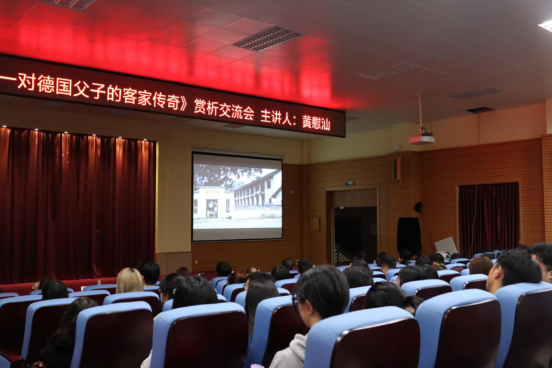 现场同学聚精会神地观看纪录片《一对德国父子的客家传奇》。纪录片讲述了十九世纪末到二十世纪四十年代,豪天立等百余名德国、瑞士国籍人士在广东梅州学习中国传统文化,了解接受客家地区民俗、促进当地教育事业发展的故事。