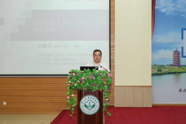20日上午,论坛特邀中国社会语言学会会长、中国英汉语比较研究会话语研究专业委员会副会长兼秘书长田海龙教授作“全球化背景下的社会语言学研究与创新发展”专题报告。中国社会语言学会理事、中山大学外国语学院丁建新教授主持论坛。