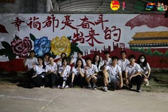 从晨光熹微到夕阳西下,一整天的工作使实践队队员们汗流浃背,却丝毫没有带走队员们创作的热情。时间过得很快,不久后天便黑了下来,但团队的绘画工作还未完成。于是队员们打开手电照明,互相配合,共同完成最后的收尾工作。在完成了整面墙绘后,队员与自己的劳动成果合影留念,记录此次三下乡活动中最令人难忘的体验。